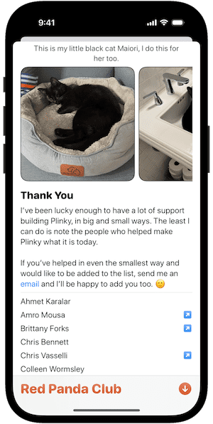 While you can say that I built this app, nothing in this world happens alone. I've had a lot of help along the way, and want to make sure anyone who's helped even in the smallest way is honored in Plinky. Plinky has a Thank You section on the About Red Panda Club screen where I've assembled everyone who's helped me while I've been building Plinky.